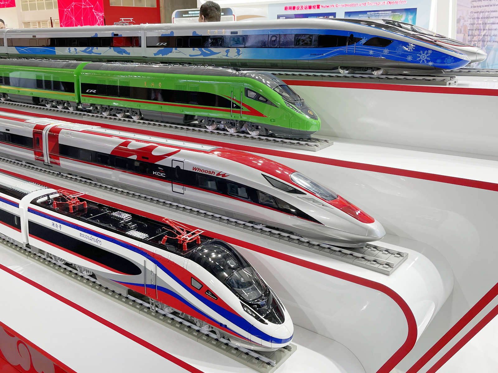 Was hatte ich noch entdeckt? China enthüllte am 24. September einen neuen, 160 km/h schnellen Intercity mit schnittigem Endwagen. Sehenwert waren außerdem Regionalzüge und Loks von Stadler, Siemens, Alstom sowie einige gelbe Fahrzeuge für die Wartung und Gleisinstandhaltung. In den Hallen gab es jede Menge Modelle von chinesischen Hochgeschwindigkeitszügen zu sehen – die meisten natürlich aus der Fuxing-Familie.