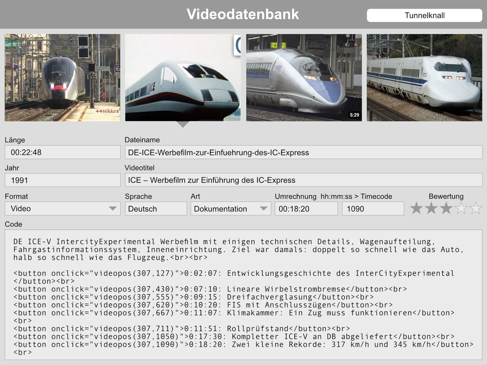 Als Betreiber einer Website investiert man in erster Linie in Zeit. Alles beginnt mit der Informationsbeschaffung. Bereits Mitte der Neunzigerjahre kaufte ich mir jede Menge Zeitschriften und Bücher über schnelle Züge. Regelmäßig schaute ich bei Newsportalen und themenverwandten Internetseiten vorbei; wichtige Infos speicherte ich ab. Beim Recherchieren nervte mich aber das langwierige Suchen und Herumblättern in den Printmedien. Also scannte ich alles ein und dachte mir ein sinnvolles Namens- und Ordnerschema aus. OCR und Spotlight von Mac OS X beschleunigten ab 2005 das Auffinden von Informationen, die sich auf der Festplatte breitmachten. In späteren Jahren entdeckte ich viele gute Videofilme und Podcast-Episoden rund um den Schienenschnellverkehr. Mit Ernüchterung musste ich feststellen, dass einige nur temporär zur Verfügung standen und wieder in der digitalen Versenkung verschwanden. Also filmte ich sie ab und speicherte sie lokal. Doch wie soll ich bestimmte Themen wiederfinden? Die Lösung bestand darin, die Videos mit Zeitmarkierungen zu verstichworten. Suche ich beispielsweise nach dem Begriff „Tunnelknall“, erscheinen alle Film- und Tonaufnahmen, in denen das Thema vorkommt. Klicke ich auf den Link, wird innerhalb der Aufnahme zur entsprechenden Position gesprungen und die Aufnahme abgespielt.